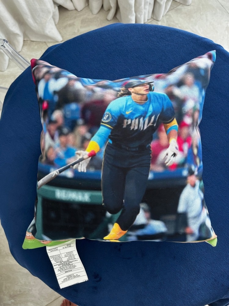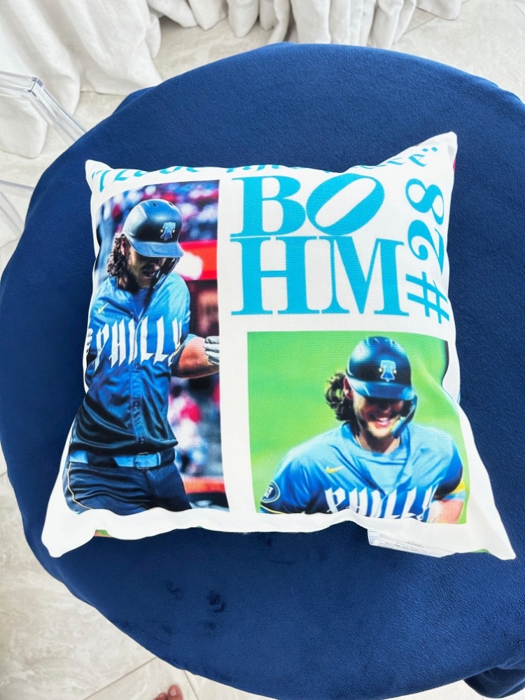 For your $40 donation the Alec Bohm Foundation will send you this sweet 18″x18″ Custom City Connect Photo Pillow.