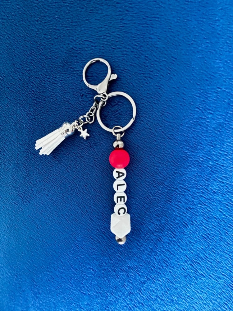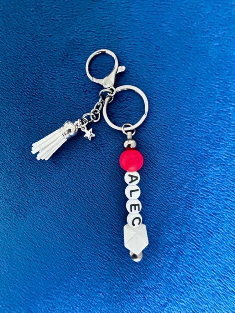 Show your support for Alec everyday with this stylish keychain. For your $12 donation the Alec Bohm Foundation will send you this 6-inch-long Alec red and white beaded keychain. The metal is a gun metal color