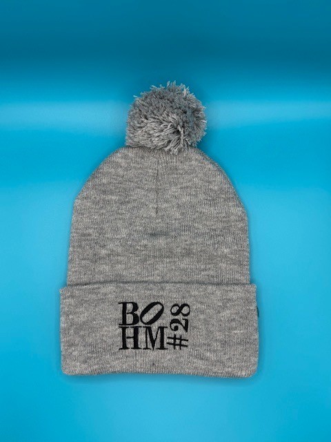 For your $24.00 donation the Alec Bohm Foundation will send you this Heather Grey Bohm 28 Pom Pom Beanie.